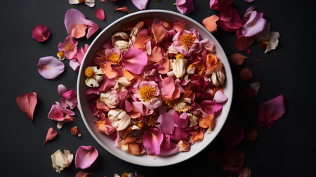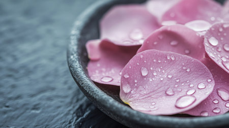 Pink rose petals with water drops are lying in a black bowl on a dark background, creating a serene and romantic atmosphere, perfect for beauty, spa, and mothers day themes