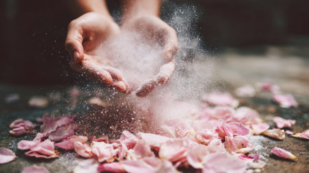 A captivating moment where soft hands gently release powder over delicate pink rose petals, creating an ethereal blend of beauty and nature.