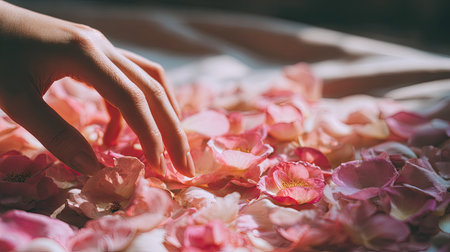 A serene composition featuring a hand gently reaching for soft rose petals scattered on a delicate fabric surface, illuminated by warm sunlight.