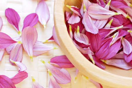wooden bowl with scattered petals