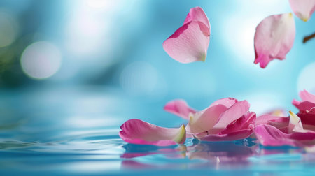 This enchanting image captures pink petals gracefully floating on a serene blue water surface, evoking feelings of tranquility and beauty in nature.