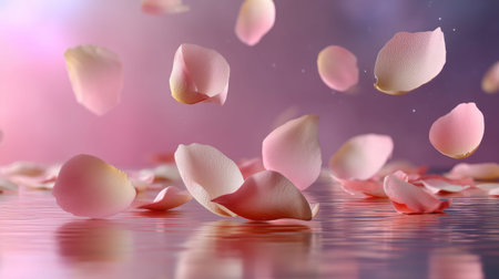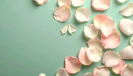 Soft pink and white rose petals are scattered and appear to flow across a light green surface, creating a gentle and...