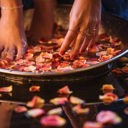 A womans feet in a bowl of water with petals, AI