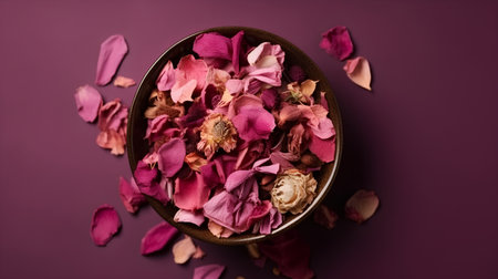 Dried rose petals in a wooden bowl on a purple background