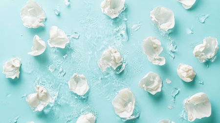 Soft white petals drift peacefully on a tranquil blue surface, enhanced with sparkling water droplets, creating a soothing and refreshing visual perfect for beauty and wellness themes.