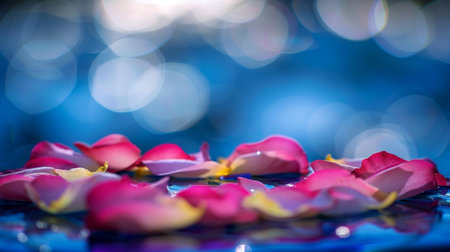 Vivid pink rose petals scattered on a shimmering blue background with soft bokeh lights.