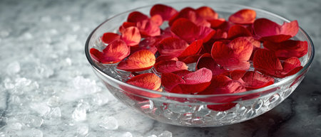 Red rose petals in a glass bowl on a marble background.