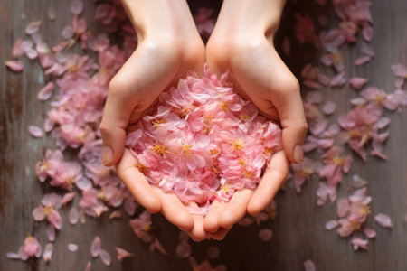 Close-up of a woman's hand with a neutral manicure, adorned with delicate flower petals.
