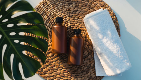 Brown bottles, white towel, and green leaf on woven mat.