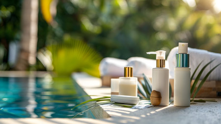 A serene setting featuring a blue cosmetic bottle resting on soft white towels, with a tranquil pool in the background, perfect for beauty and wellness promotions.