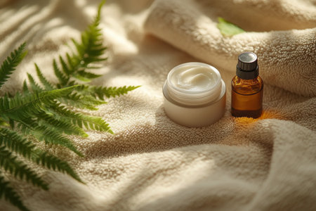 On a textured cloth, two skincare items are displayed. A small jar of cream sits beside a bottle of oil, surrounded by fern leaves in warm morning sunlight, creating a peaceful atmosphere.