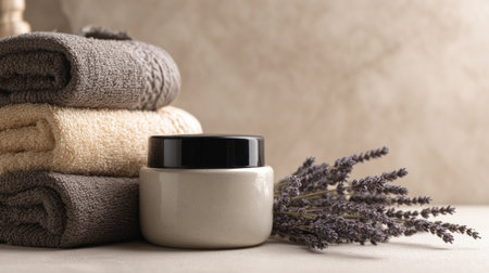 A cosmetic cream jar sits centrally in front of neatly folded towels, arranged with a sprig of lavender. The scene utilizes a neutral color palette, featuring tones of brown, beige, and gray. The composition has soft lighting and suggests a spa or wellness setting, suitable for promotional material.