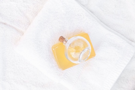 bottle and soap on a white towel