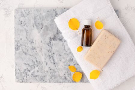 Seasonal Spa set Massage oils, soap, towels on gray marble plate, organic cosmetic products, aromatherapy and alternative medicine concept, spa salon banner, flyer, coupon