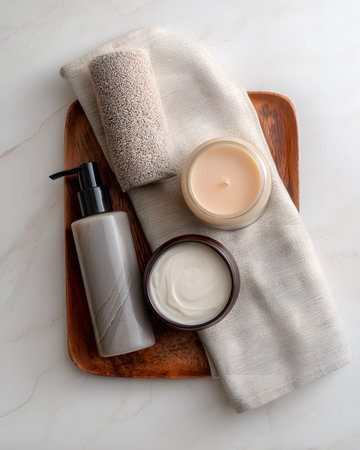 A composition showcasing essential skincare products, gently arranged on a plush towel within a wooden tray. The scene embodies tranquility and luxury, portraying a moment of self-care and pampering.
