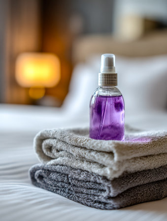 A small container filled with vibrant purple disinfectant rests atop neatly folded towels, surrounded by soft bedding, evoking a sense of comfort and cleanliness in a warm bedroom.