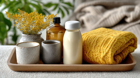 A warm and inviting arrangement featuring a yellow towel, milk bottle, cozy vases, and decorative flowers on a wooden tray, perfect for a spa day.