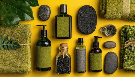 Flat lay composition of various spa products, including bottles of lotions, jars of bath salts, and a textured sponge, arranged on a bright yellow surface. Green towels and stones are also included in the display.