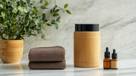 Zero waste bathroom accessories, natural sisal brush, aroma oil, metal jar, cotton towel, essential oil on marble plate, minimal eco-friendly background, minimal stylish set