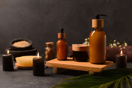 Wooden board with cosmetic products, burning candles and palm leaf on dark background