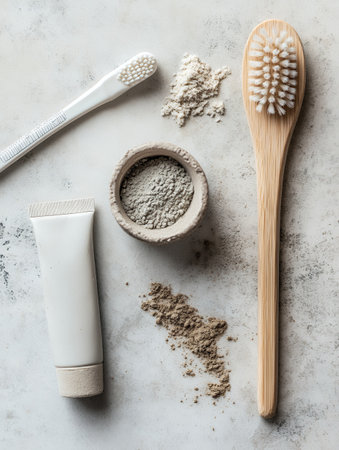 An eco-friendly dental care set with bamboo toothbrush, toothpaste, and natural powders on a light surface.