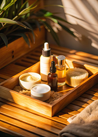 A calming image featuring spa and wellness essentials arranged on a rustic wooden tray. The minimalistic composition and natural tones evoke a sense of serenity and promote self-care and relaxation.