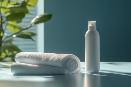 A calming arrangement features a pump bottle and a small jar of skincare cream on a neatly folded towel, illuminated by soft natural light.