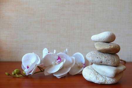 Pattern of smooth flat sea stones and dried flowers on the table copy space