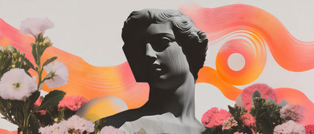 Minimalist collage featuring a statue amidst floral and swirling smoke patterns
