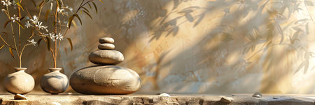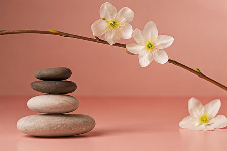 Podium for product display with feng shui japandi style light background with stones and plants. 3d rendering.