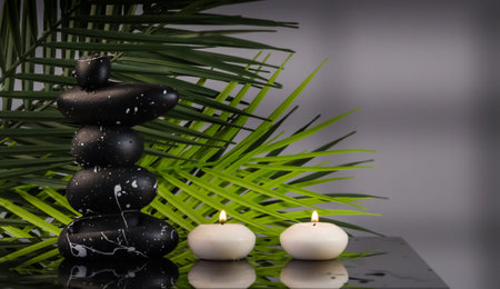 Spa still life with scented candles, stones, flowers and a bath towel. Horizontal photo. Horizontal photo.