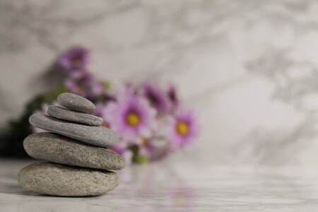 river pebbles with daisies unfocused on marble background. Dlear picture