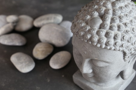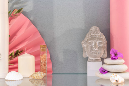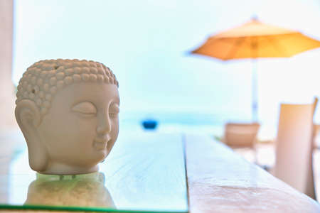 Welcome spa composition with exotic flowers and Buddha head statues. Massage and beauty salon in luxury tropical resort
