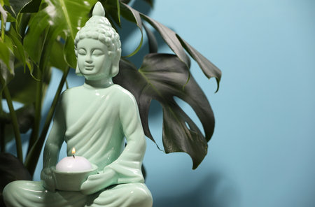 Buddhism religion. Decorative Buddha statue with burning candle and monster against light blue wall, space for text