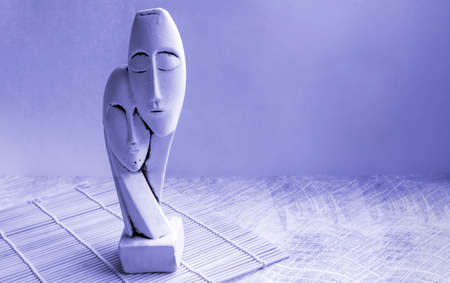 A statuette of a couple isolated on a lilac background very peri. The face of a man and a woman. place for your text.