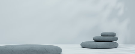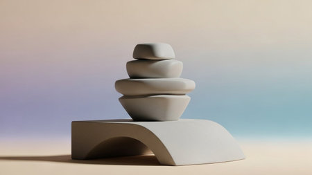 Against showing stack of smooth gray stones balanced on a curved gray pedestal against a soft gradient background....