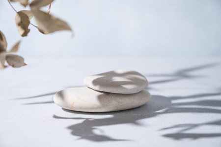 Stone oval with shadow of plants on a light background for product demonstration. Trendy neutral aesthetic layout template for beauty and cosmetics scene with free space for text.