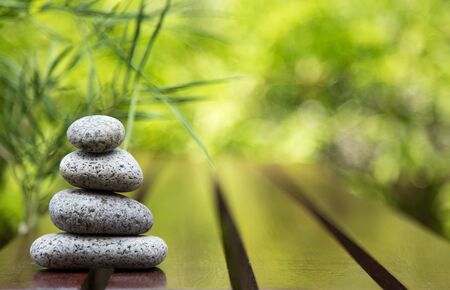 Balance Zen stones and yellow plumeria on wood with green bokeh background. Zen and Spa concept.