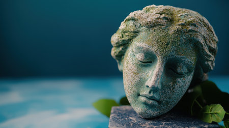 A tranquil bronze visage, aged gracefully with patina, peeks through vibrant foliage, embodied timeless calm amid nature's lush embrace.