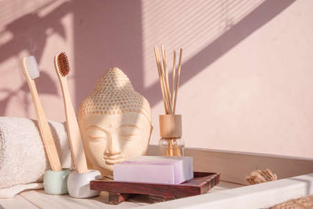 White Buddha bust on pastel pink background decorated with shades. Zero waste bamboo toothbrush. Spa asian style. Relax mood. Yoga background. Eco friendly . High quality photo