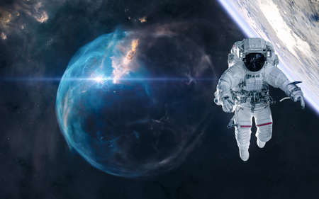 Astronaut spaceman do spacewalk while working for space station. Mixed media