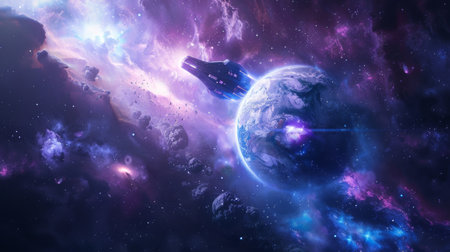Digital illustration of an asteroid belt orbiting Earth, depicting a concept of space exploration and cosmic debris in a vast universe