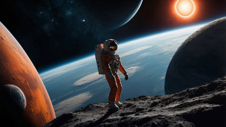 A solitary astronaut explores Mars's rugged terrain, while Earth glows distantly in the cosmic background under the brilliance of stars. AI generated image