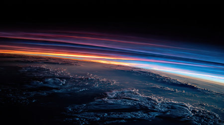 An artistic depiction presents a view of Earth's atmosphere, highlighting colorful layers of light. The composition features cloud formations below, with a blend of orange, blue, and black hues, suggesting a sunrise or sunset. The image's details and style lend themselves to editorial or commercial applications.