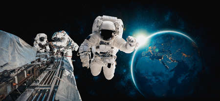 Astronaut spaceman do spacewalk while working for spaceflight mission at space station . Astronaut wear full spacesuit for operation . Elements of this image furnished by NASA space astronaut photos .