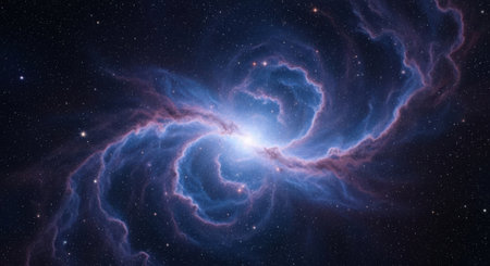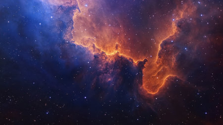 A stunning nebula showcases brilliant shades of blue, purple, and orange, revealing cosmic gas and stars in deep space.