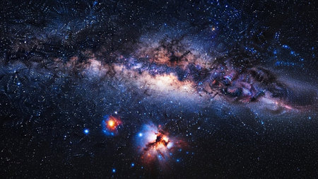 A view of the Milky Way galaxy stretches across the frame, showcasing its intricate spiral arms filled with billions of stars. Vibrant nebulae in hues of purple, blue, orange, and red add bursts of color and texture to the deep space canvas. Countless pinpricks of light represent distant stars, creating a sense of immense scale and depth. This celestial panorama evokes feelings of awe and wonder, highlighting the vastness and beauty of the universe.