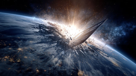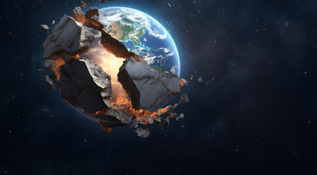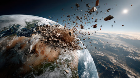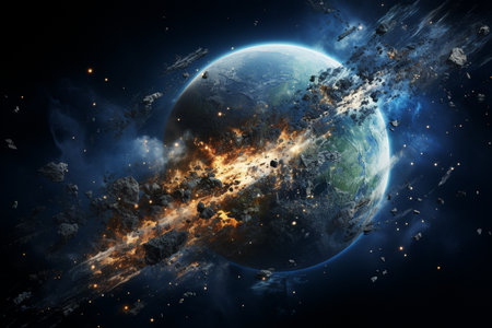 A stunning digital illustration captures Earth amidst a catastrophic asteroid impact, showcasing the chaos of space debris and the majestic view of the planet.