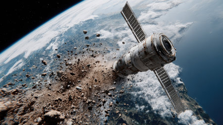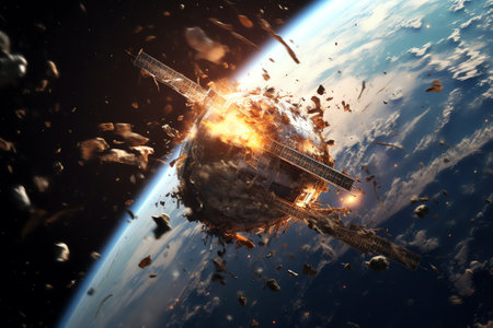 A striking image of a satellite disintegrating in space, with debris scattered across the atmosphere while it orbits the Earth, showcasing technological impacts.