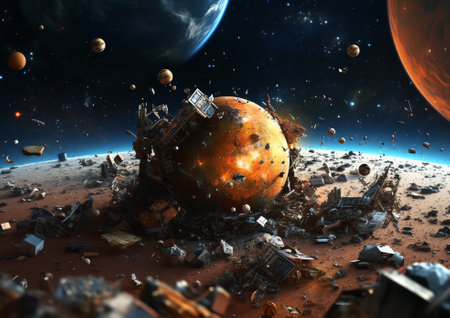 This captivating image showcases the dramatic scene of space debris orbiting Earth, with striking details highlighting the contrast between the planet and the surrounding chaos.